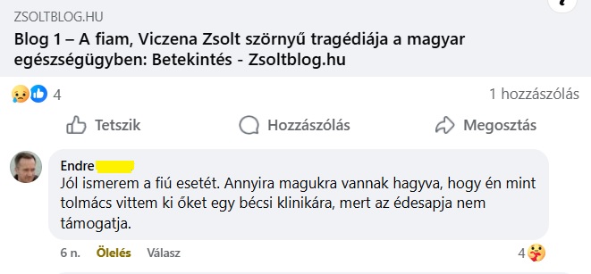 Amikor a Facebookon közzétettem a betegségtörténetét sokan írták, hogy nem voltak képesek egyszerre végigolvasni a teljes írást, sírtak, megkönnyezték, hogy ennek a fiatalembernek semmit nem akartak elfogadni az orvosok, nem hittek a súlyos tüneteinek, állapotának és mulasztásokkal, orvosi hibákkal, döbbenetes negligenciával lépésről lépésre megnyomorították őt.